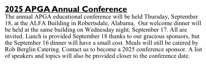 You will receive information on the APGA’s annual summer tour that is held the first Tuesday in August and on the annual conference held the third Thursday in September.